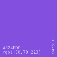 Цвет #824FDF в цветовой модели RGB обозначается тремя октетами (130, 79, 223) в десятичном формате и #824FDF в шестнадцатиричном (hex) формате, которые являются интенсивностью красного 130 (hex 82), интенсивность зелёного 79 (hex 4F) и интенсивность синего 223 (hex DF).