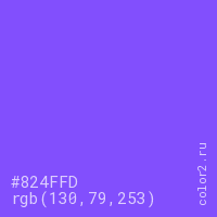 Цвет #824FFD в цветовой модели RGB обозначается тремя октетами (130, 79, 253) в десятичном формате и #824FFD в шестнадцатиричном (hex) формате, которые являются интенсивностью красного 130 (hex 82), интенсивность зелёного 79 (hex 4F) и интенсивность синего 253 (hex FD).