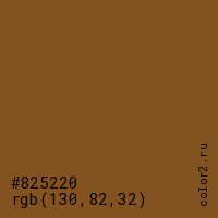 Цвет #825220 в цветовой модели RGB обозначается тремя октетами (130, 82, 32) в десятичном формате и #825220 в шестнадцатиричном (hex) формате, которые являются интенсивностью красного 130 (hex 82), интенсивность зелёного 82 (hex 52) и интенсивность синего 32 (hex 20).