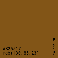 Цвет #825517 в цветовой модели RGB обозначается тремя октетами (130, 85, 23) в десятичном формате и #825517 в шестнадцатиричном (hex) формате, которые являются интенсивностью красного 130 (hex 82), интенсивность зелёного 85 (hex 55) и интенсивность синего 23 (hex 17).