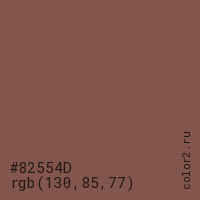 Цвет #82554D в цветовой модели RGB обозначается тремя октетами (130, 85, 77) в десятичном формате и #82554D в шестнадцатиричном (hex) формате, которые являются интенсивностью красного 130 (hex 82), интенсивность зелёного 85 (hex 55) и интенсивность синего 77 (hex 4D).
