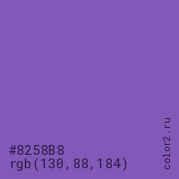 Цвет #8258B8 в цветовой модели RGB обозначается тремя октетами (130, 88, 184) в десятичном формате и #8258B8 в шестнадцатиричном (hex) формате, которые являются интенсивностью красного 130 (hex 82), интенсивность зелёного 88 (hex 58) и интенсивность синего 184 (hex B8).
