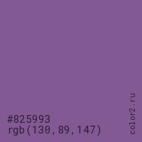 Цвет #825993 в цветовой модели RGB обозначается тремя октетами (130, 89, 147) в десятичном формате и #825993 в шестнадцатиричном (hex) формате, которые являются интенсивностью красного 130 (hex 82), интенсивность зелёного 89 (hex 59) и интенсивность синего 147 (hex 93).