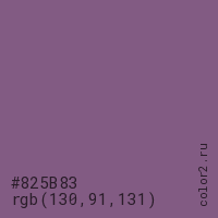 Цвет #825B83 в цветовой модели RGB обозначается тремя октетами (130, 91, 131) в десятичном формате и #825B83 в шестнадцатиричном (hex) формате, которые являются интенсивностью красного 130 (hex 82), интенсивность зелёного 91 (hex 5B) и интенсивность синего 131 (hex 83).