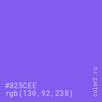 Цвет #825CEE в цветовой модели RGB обозначается тремя октетами (130, 92, 238) в десятичном формате и #825CEE в шестнадцатиричном (hex) формате, которые являются интенсивностью красного 130 (hex 82), интенсивность зелёного 92 (hex 5C) и интенсивность синего 238 (hex EE).
