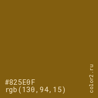 Цвет #825E0F в цветовой модели RGB обозначается тремя октетами (130, 94, 15) в десятичном формате и #825E0F в шестнадцатиричном (hex) формате, которые являются интенсивностью красного 130 (hex 82), интенсивность зелёного 94 (hex 5E) и интенсивность синего 15 (hex 0F).