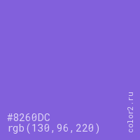 Цвет #8260DC в цветовой модели RGB обозначается тремя октетами (130, 96, 220) в десятичном формате и #8260DC в шестнадцатиричном (hex) формате, которые являются интенсивностью красного 130 (hex 82), интенсивность зелёного 96 (hex 60) и интенсивность синего 220 (hex DC).