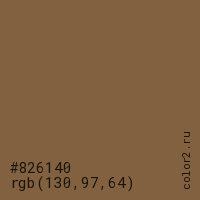 Цвет #826140 в цветовой модели RGB обозначается тремя октетами (130, 97, 64) в десятичном формате и #826140 в шестнадцатиричном (hex) формате, которые являются интенсивностью красного 130 (hex 82), интенсивность зелёного 97 (hex 61) и интенсивность синего 64 (hex 40).