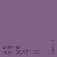 Цвет #826188 в цветовой модели RGB обозначается тремя октетами (130, 97, 136) в десятичном формате и #826188 в шестнадцатиричном (hex) формате, которые являются интенсивностью красного 130 (hex 82), интенсивность зелёного 97 (hex 61) и интенсивность синего 136 (hex 88).