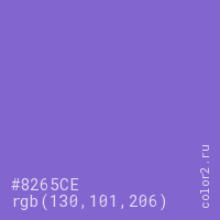 Цвет #8265CE в цветовой модели RGB обозначается тремя октетами (130, 101, 206) в десятичном формате и #8265CE в шестнадцатиричном (hex) формате, которые являются интенсивностью красного 130 (hex 82), интенсивность зелёного 101 (hex 65) и интенсивность синего 206 (hex CE).