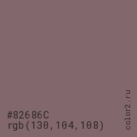 Цвет #82686C в цветовой модели RGB обозначается тремя октетами (130, 104, 108) в десятичном формате и #82686C в шестнадцатиричном (hex) формате, которые являются интенсивностью красного 130 (hex 82), интенсивность зелёного 104 (hex 68) и интенсивность синего 108 (hex 6C).