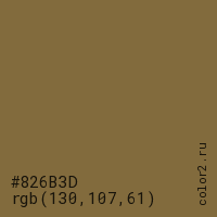 Цвет #826B3D в цветовой модели RGB обозначается тремя октетами (130, 107, 61) в десятичном формате и #826B3D в шестнадцатиричном (hex) формате, которые являются интенсивностью красного 130 (hex 82), интенсивность зелёного 107 (hex 6B) и интенсивность синего 61 (hex 3D).