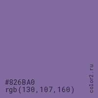 Цвет #826BA0 в цветовой модели RGB обозначается тремя октетами (130, 107, 160) в десятичном формате и #826BA0 в шестнадцатиричном (hex) формате, которые являются интенсивностью красного 130 (hex 82), интенсивность зелёного 107 (hex 6B) и интенсивность синего 160 (hex A0).