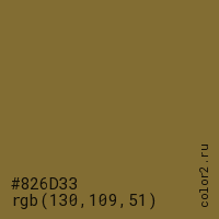 Цвет #826D33 в цветовой модели RGB обозначается тремя октетами (130, 109, 51) в десятичном формате и #826D33 в шестнадцатиричном (hex) формате, которые являются интенсивностью красного 130 (hex 82), интенсивность зелёного 109 (hex 6D) и интенсивность синего 51 (hex 33).