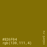 Цвет #826F04 в цветовой модели RGB обозначается тремя октетами (130, 111, 4) в десятичном формате и #826F04 в шестнадцатиричном (hex) формате, которые являются интенсивностью красного 130 (hex 82), интенсивность зелёного 111 (hex 6F) и интенсивность синего 4 (hex 04).