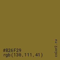 Цвет #826F29 в цветовой модели RGB обозначается тремя октетами (130, 111, 41) в десятичном формате и #826F29 в шестнадцатиричном (hex) формате, которые являются интенсивностью красного 130 (hex 82), интенсивность зелёного 111 (hex 6F) и интенсивность синего 41 (hex 29).
