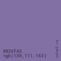 Цвет #826FA3 в цветовой модели RGB обозначается тремя октетами (130, 111, 163) в десятичном формате и #826FA3 в шестнадцатиричном (hex) формате, которые являются интенсивностью красного 130 (hex 82), интенсивность зелёного 111 (hex 6F) и интенсивность синего 163 (hex A3).