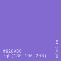 Цвет #826AD0 в цветовой модели RGB обозначается тремя октетами (130, 106, 208) в десятичном формате и #826AD0 в шестнадцатиричном (hex) формате, которые являются интенсивностью красного 130 (hex 82), интенсивность зелёного 106 (hex 6A) и интенсивность синего 208 (hex D0).