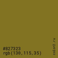 Цвет #827323 в цветовой модели RGB обозначается тремя октетами (130, 115, 35) в десятичном формате и #827323 в шестнадцатиричном (hex) формате, которые являются интенсивностью красного 130 (hex 82), интенсивность зелёного 115 (hex 73) и интенсивность синего 35 (hex 23).