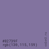 Цвет #82739F в цветовой модели RGB обозначается тремя октетами (130, 115, 159) в десятичном формате и #82739F в шестнадцатиричном (hex) формате, которые являются интенсивностью красного 130 (hex 82), интенсивность зелёного 115 (hex 73) и интенсивность синего 159 (hex 9F).