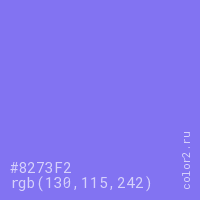 Цвет #8273F2 в цветовой модели RGB обозначается тремя октетами (130, 115, 242) в десятичном формате и #8273F2 в шестнадцатиричном (hex) формате, которые являются интенсивностью красного 130 (hex 82), интенсивность зелёного 115 (hex 73) и интенсивность синего 242 (hex F2).