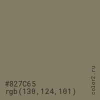 Цвет #827C65 в цветовой модели RGB обозначается тремя октетами (130, 124, 101) в десятичном формате и #827C65 в шестнадцатиричном (hex) формате, которые являются интенсивностью красного 130 (hex 82), интенсивность зелёного 124 (hex 7C) и интенсивность синего 101 (hex 65).