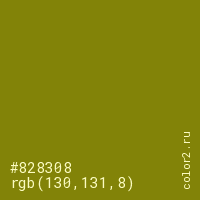 Цвет #828308 в цветовой модели RGB обозначается тремя октетами (130, 131, 8) в десятичном формате и #828308 в шестнадцатиричном (hex) формате, которые являются интенсивностью красного 130 (hex 82), интенсивность зелёного 131 (hex 83) и интенсивность синего 8 (hex 08).