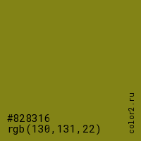 Цвет #828316 в цветовой модели RGB обозначается тремя октетами (130, 131, 22) в десятичном формате и #828316 в шестнадцатиричном (hex) формате, которые являются интенсивностью красного 130 (hex 82), интенсивность зелёного 131 (hex 83) и интенсивность синего 22 (hex 16).
