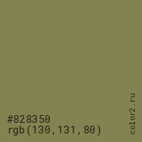 Цвет #828350 в цветовой модели RGB обозначается тремя октетами (130, 131, 80) в десятичном формате и #828350 в шестнадцатиричном (hex) формате, которые являются интенсивностью красного 130 (hex 82), интенсивность зелёного 131 (hex 83) и интенсивность синего 80 (hex 50).