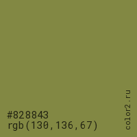 Цвет #828843 в цветовой модели RGB обозначается тремя октетами (130, 136, 67) в десятичном формате и #828843 в шестнадцатиричном (hex) формате, которые являются интенсивностью красного 130 (hex 82), интенсивность зелёного 136 (hex 88) и интенсивность синего 67 (hex 43).