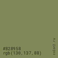 Цвет #828958 в цветовой модели RGB обозначается тремя октетами (130, 137, 88) в десятичном формате и #828958 в шестнадцатиричном (hex) формате, которые являются интенсивностью красного 130 (hex 82), интенсивность зелёного 137 (hex 89) и интенсивность синего 88 (hex 58).