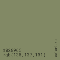 Цвет #828965 в цветовой модели RGB обозначается тремя октетами (130, 137, 101) в десятичном формате и #828965 в шестнадцатиричном (hex) формате, которые являются интенсивностью красного 130 (hex 82), интенсивность зелёного 137 (hex 89) и интенсивность синего 101 (hex 65).