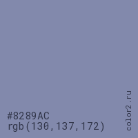 Цвет #8289AC в цветовой модели RGB обозначается тремя октетами (130, 137, 172) в десятичном формате и #8289AC в шестнадцатиричном (hex) формате, которые являются интенсивностью красного 130 (hex 82), интенсивность зелёного 137 (hex 89) и интенсивность синего 172 (hex AC).