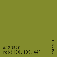 Цвет #828B2C в цветовой модели RGB обозначается тремя октетами (130, 139, 44) в десятичном формате и #828B2C в шестнадцатиричном (hex) формате, которые являются интенсивностью красного 130 (hex 82), интенсивность зелёного 139 (hex 8B) и интенсивность синего 44 (hex 2C).