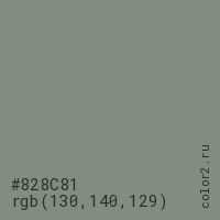 Цвет #828C81 в цветовой модели RGB обозначается тремя октетами (130, 140, 129) в десятичном формате и #828C81 в шестнадцатиричном (hex) формате, которые являются интенсивностью красного 130 (hex 82), интенсивность зелёного 140 (hex 8C) и интенсивность синего 129 (hex 81).