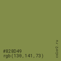 Цвет #828D49 в цветовой модели RGB обозначается тремя октетами (130, 141, 73) в десятичном формате и #828D49 в шестнадцатиричном (hex) формате, которые являются интенсивностью красного 130 (hex 82), интенсивность зелёного 141 (hex 8D) и интенсивность синего 73 (hex 49).