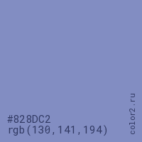 Цвет #828DC2 в цветовой модели RGB обозначается тремя октетами (130, 141, 194) в десятичном формате и #828DC2 в шестнадцатиричном (hex) формате, которые являются интенсивностью красного 130 (hex 82), интенсивность зелёного 141 (hex 8D) и интенсивность синего 194 (hex C2).