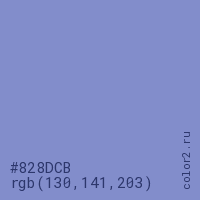 Цвет #828DCB в цветовой модели RGB обозначается тремя октетами (130, 141, 203) в десятичном формате и #828DCB в шестнадцатиричном (hex) формате, которые являются интенсивностью красного 130 (hex 82), интенсивность зелёного 141 (hex 8D) и интенсивность синего 203 (hex CB).