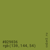 Цвет #829036 в цветовой модели RGB обозначается тремя октетами (130, 144, 54) в десятичном формате и #829036 в шестнадцатиричном (hex) формате, которые являются интенсивностью красного 130 (hex 82), интенсивность зелёного 144 (hex 90) и интенсивность синего 54 (hex 36).