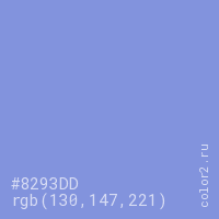 Цвет #8293DD в цветовой модели RGB обозначается тремя октетами (130, 147, 221) в десятичном формате и #8293DD в шестнадцатиричном (hex) формате, которые являются интенсивностью красного 130 (hex 82), интенсивность зелёного 147 (hex 93) и интенсивность синего 221 (hex DD).