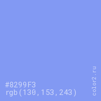 Цвет #8299F3 в цветовой модели RGB обозначается тремя октетами (130, 153, 243) в десятичном формате и #8299F3 в шестнадцатиричном (hex) формате, которые являются интенсивностью красного 130 (hex 82), интенсивность зелёного 153 (hex 99) и интенсивность синего 243 (hex F3).