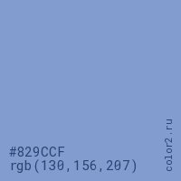 Цвет #829CCF в цветовой модели RGB обозначается тремя октетами (130, 156, 207) в десятичном формате и #829CCF в шестнадцатиричном (hex) формате, которые являются интенсивностью красного 130 (hex 82), интенсивность зелёного 156 (hex 9C) и интенсивность синего 207 (hex CF).
