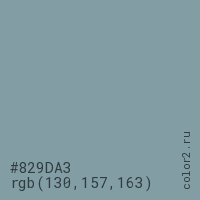 Цвет #829DA3 в цветовой модели RGB обозначается тремя октетами (130, 157, 163) в десятичном формате и #829DA3 в шестнадцатиричном (hex) формате, которые являются интенсивностью красного 130 (hex 82), интенсивность зелёного 157 (hex 9D) и интенсивность синего 163 (hex A3).