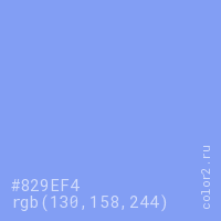Цвет #829EF4 в цветовой модели RGB обозначается тремя октетами (130, 158, 244) в десятичном формате и #829EF4 в шестнадцатиричном (hex) формате, которые являются интенсивностью красного 130 (hex 82), интенсивность зелёного 158 (hex 9E) и интенсивность синего 244 (hex F4).