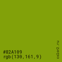 Цвет #82A109 в цветовой модели RGB обозначается тремя октетами (130, 161, 9) в десятичном формате и #82A109 в шестнадцатиричном (hex) формате, которые являются интенсивностью красного 130 (hex 82), интенсивность зелёного 161 (hex A1) и интенсивность синего 9 (hex 09).