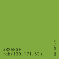 Цвет #82AB3F в цветовой модели RGB обозначается тремя октетами (130, 171, 63) в десятичном формате и #82AB3F в шестнадцатиричном (hex) формате, которые являются интенсивностью красного 130 (hex 82), интенсивность зелёного 171 (hex AB) и интенсивность синего 63 (hex 3F).