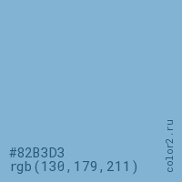 Цвет #82B3D3 в цветовой модели RGB обозначается тремя октетами (130, 179, 211) в десятичном формате и #82B3D3 в шестнадцатиричном (hex) формате, которые являются интенсивностью красного 130 (hex 82), интенсивность зелёного 179 (hex B3) и интенсивность синего 211 (hex D3).
