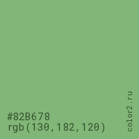 Цвет #82B678 в цветовой модели RGB обозначается тремя октетами (130, 182, 120) в десятичном формате и #82B678 в шестнадцатиричном (hex) формате, которые являются интенсивностью красного 130 (hex 82), интенсивность зелёного 182 (hex B6) и интенсивность синего 120 (hex 78).