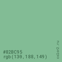 Цвет #82BC95 в цветовой модели RGB обозначается тремя октетами (130, 188, 149) в десятичном формате и #82BC95 в шестнадцатиричном (hex) формате, которые являются интенсивностью красного 130 (hex 82), интенсивность зелёного 188 (hex BC) и интенсивность синего 149 (hex 95).