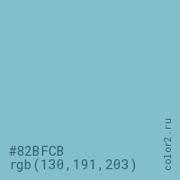 Цвет #82BFCB в цветовой модели RGB обозначается тремя октетами (130, 191, 203) в десятичном формате и #82BFCB в шестнадцатиричном (hex) формате, которые являются интенсивностью красного 130 (hex 82), интенсивность зелёного 191 (hex BF) и интенсивность синего 203 (hex CB).